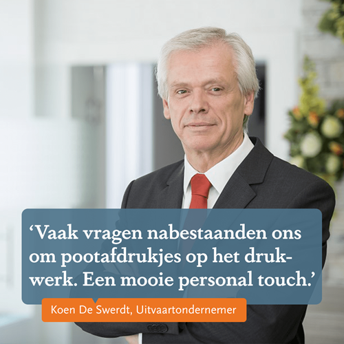 Die intieme sfeer is vaak het decor voor familierituelen. De keuze van de kleren die de overledene in de kist zal dragen, bijvoorbeeld. Komt de familie nog een laatste keer samen in de groetkamer om het glas te heffen op de overledene? Ook bij het sluiten van de kist komt vaak een ritueel kijken: een laatste aanraking, het dichtdraaien van de knoppen van het deksel van de kist of het plaatsen van voorwerpen die je wil meegeven in de kist: foto’s, een brief, de knuffel of favoriete sjaal… ‘We drukken families wel altijd op het hart om goed na te denken of ze die spullen echt wil meegeven, of ze misschien willen bijhouden als troostend aandenken’, geeft Koen De Swerdt nog mee. Check ook steeds met de uitvaartondernemer of het voorwerp wel degelijk meegegeven mag worden in de kist. Brandbare zaken zijn bijvoorbeeld niet toegelaten.